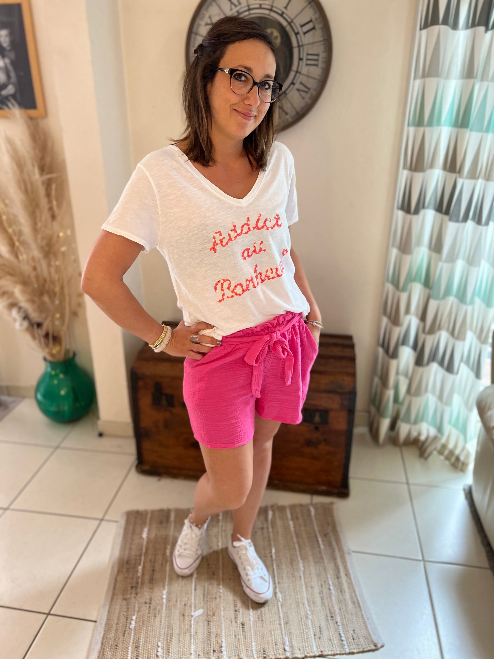 Short en gaz de coton avec lien a nouer à la taille et poche sur le devant